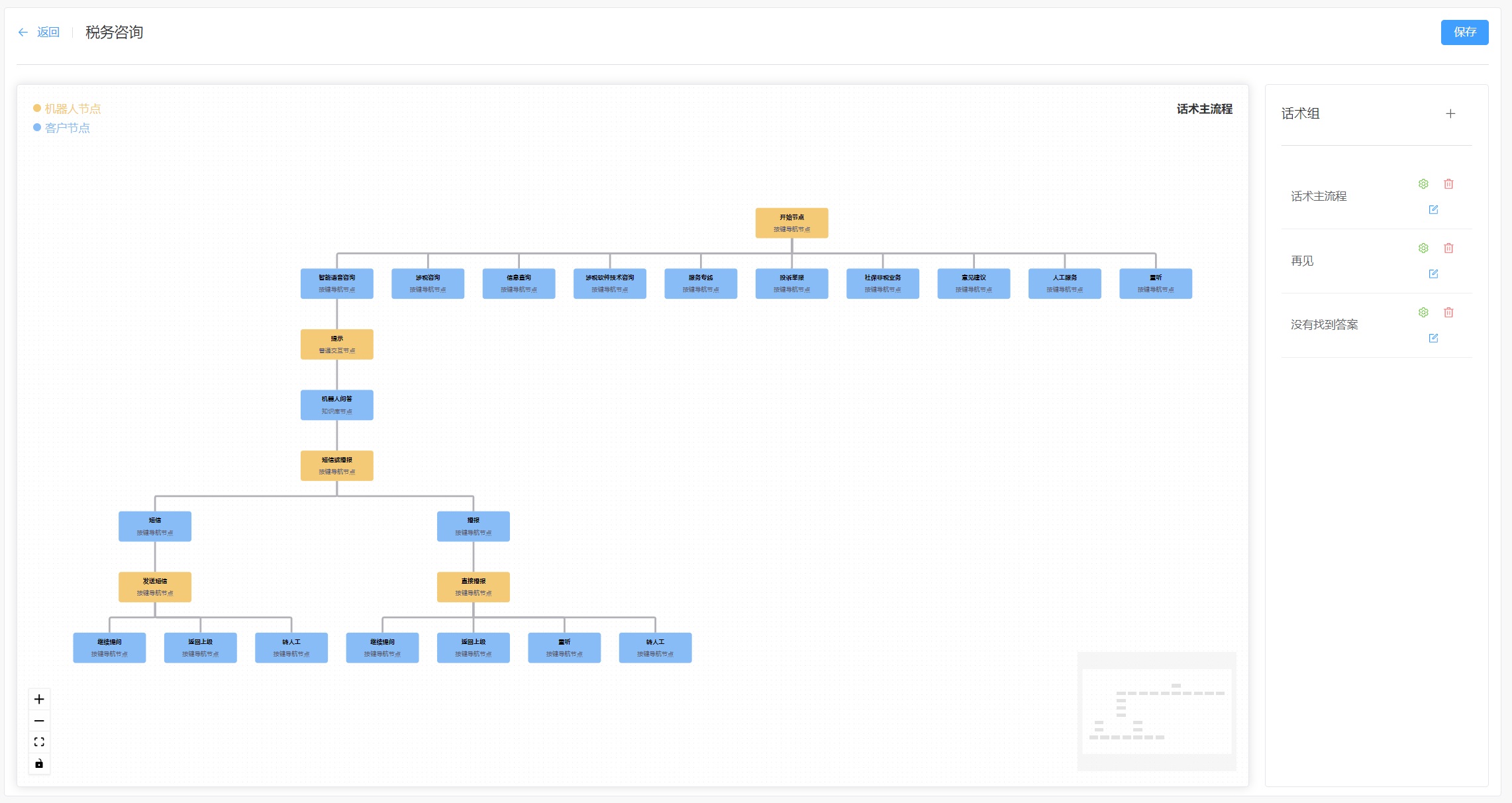 通过搭建(欢迎语-确认咨询类型-确认咨询问题-咨询问题解答-结束挂机)的话术流程,对用户的来电咨询类别进行分类,当机器人无法解决时,自动转接对应队列的人工客服。